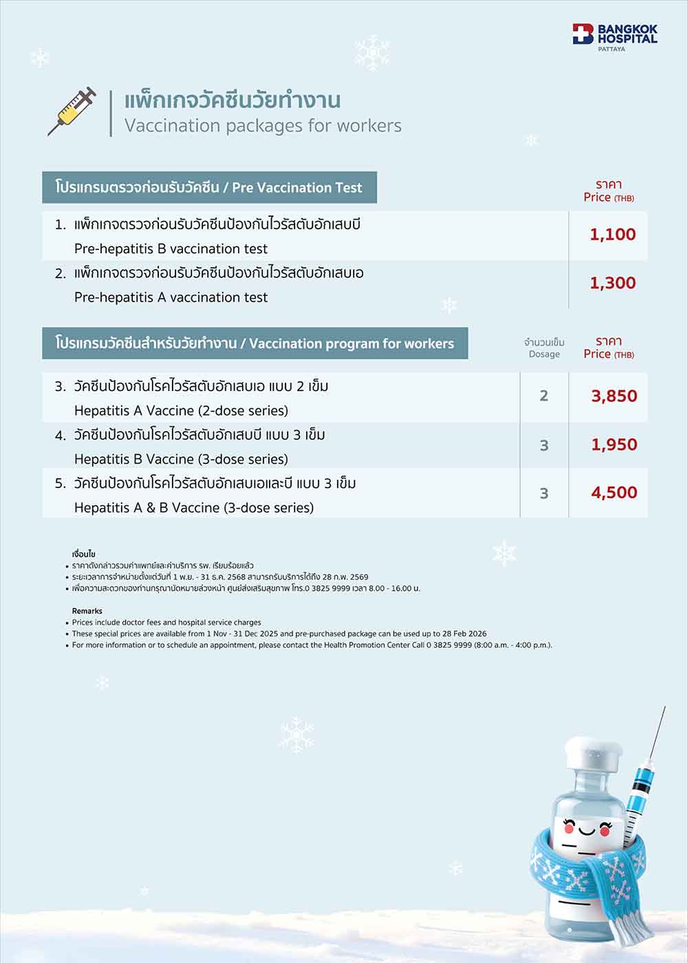 - Pre-vaccination check-up package for Hepatitis B vaccine Price 1,100 THB