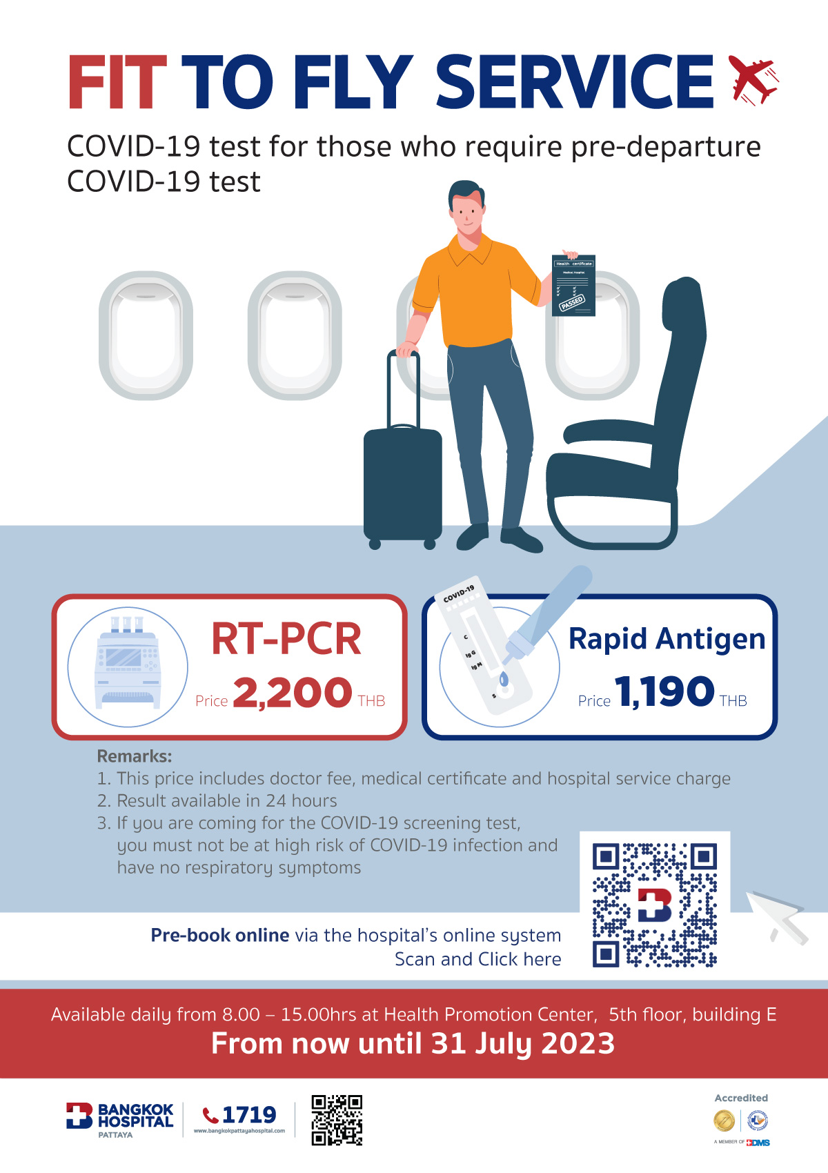 Готов к полету Home > Services > Fit to fly Предварительная запись здесь Доступно ежедневно с 08.00 до 15.00 (с сегодняшнего дня до 31 июля 2023 г.) В Центре укрепления здоровья, 5 этаж, корпус Е БРОНИРОВАНИЕ ОНЛАЙН Только для тех, кто записывается на предварительную запись через онлайн-систему больницы