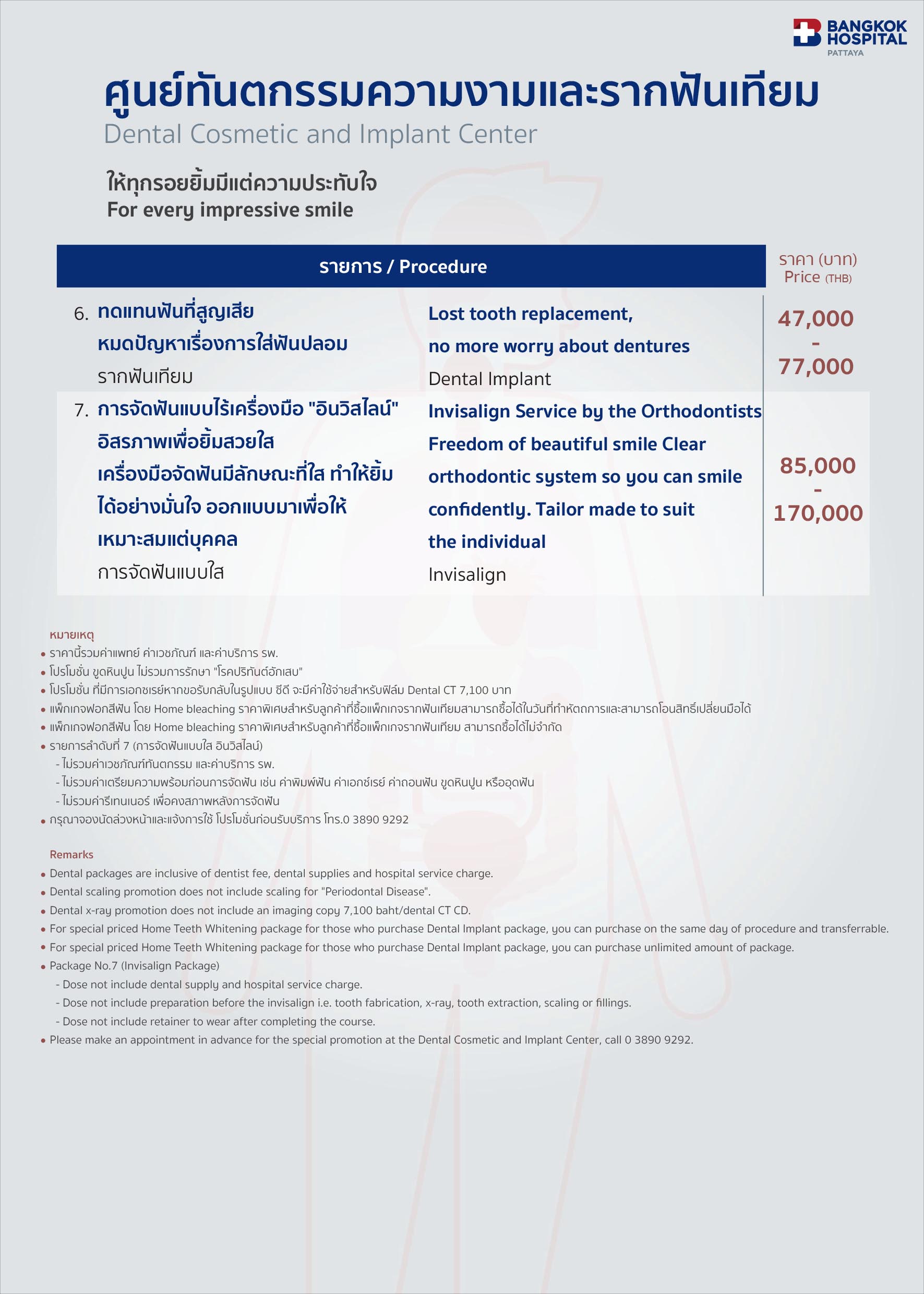 - แพ็กเกจฟอกสีฟัน โดย Home bleaching ราคาพิเศษสำหรับลูกค้าที่ซื้อแพ็กเกจรากฟันเทียมสามารถซื้อได้ในวันที่ทำหัตถการและสามารถโอนสิทธิ์เปลี่ยนมือได้