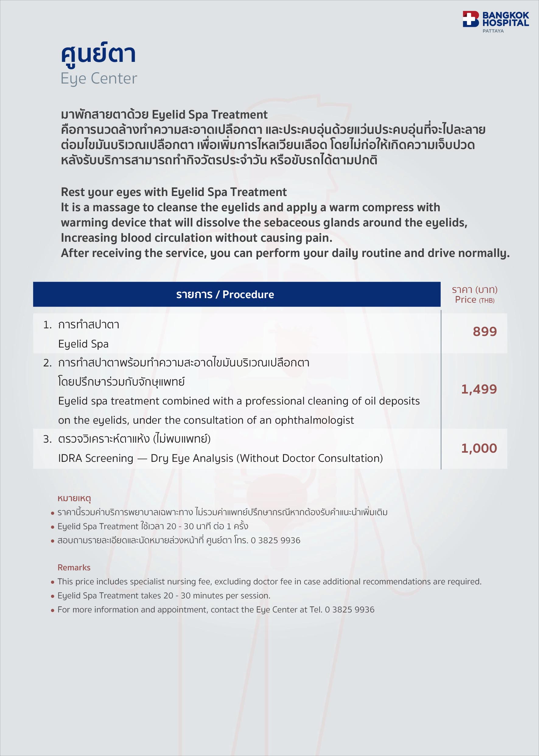 - การทำสปาตาพร้อมทำความสะอาดไขมันบริเวณเปลือกตาโดยปรึกษาร่วมกับจักษุแพทย์ ราคา 1,499 บาท