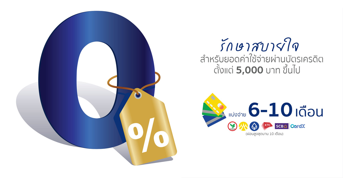 สําหรับยอดค่าใช้จ่ายผ่านบัตรเครดิต ตั้งแต่ 5,000-10,000 บาท ขึ้นไป แบ่งจ่าย 0% นาน 6-10 เดือน ธนาคารที่ร่วมโครงการ KBANK ,BBL ,krungsri ,KTC ,SCB ,CardX